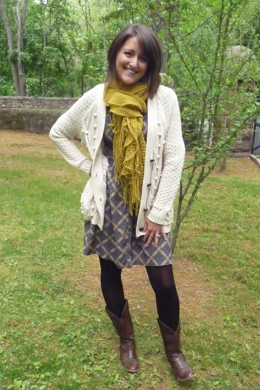 | Aldo sunglasses, garage sale earrings, Old Navy bag, Forever 21 dress, Moth cardigan via Anthropologie, Anthropologie belt, Movado watch, vintage ring, DKNY tights, Target cowboy boots, |